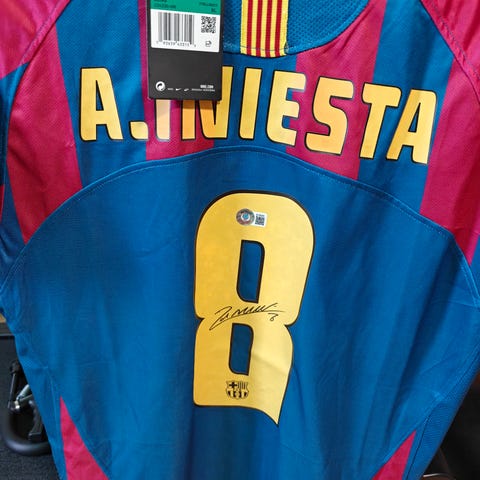 Iniesta, Barcelona, signed, autograph, kapteinsbind, captain armband, fotball, memorabilia, samleobjekt, La Liga,apania, legend, barca