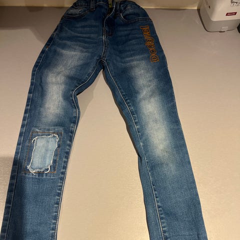 Retro jeansbukse i denim i blå farge for barn, unisex, størrelse 5 år. Sydd av Mormor og Mio. Buksa har rette ben og påsydde baklommer i kontraststoff. Materialet er denim som gir et robust og slitesterkt plagg egnet til hverdagsbruk. 250 kr for begge, eller 150 kr pr. stk.