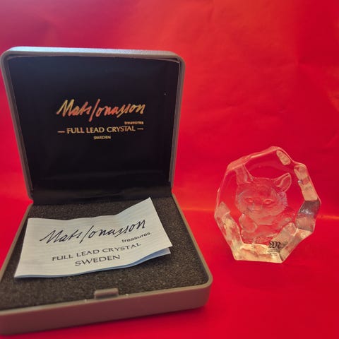 Signert ugle skulptur av designer Mats Johansson, Målerås, Sverige. Den er gjort i hånd gravert blykrystall. Den er signert og ligger i orginal esken. Skulpturen måler 15 x 12 x 3,5 cm.