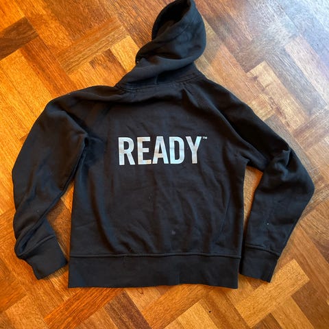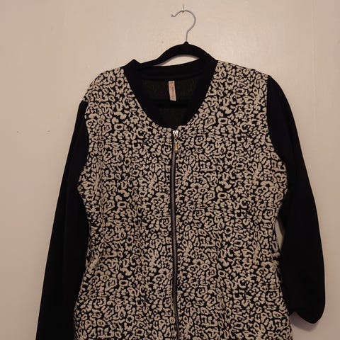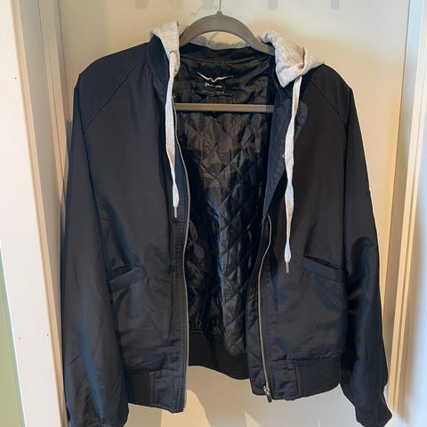 New Yorker FB Sister ytterjakke for dame i størrelse L. Jakken er svart og laget i polyester. Den har hette i kontrastmateriale, glidelåslukking foran og sidelommer med knapp. Ribbkant nederst og ved ermene gir en mer tettsittende avslutning. På ryggen er det trykk med navn på ulike storbyer. Egnet som lett ytterjakke i hverdagen.