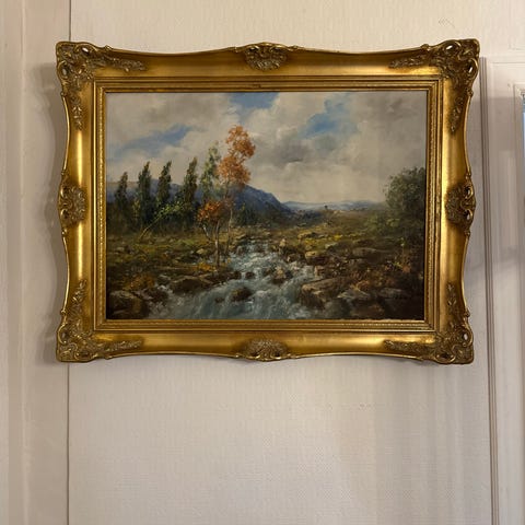 Stort bilde (reproduksjon, ikke malt) av den kjente maleren JC Dahl, «Bjørk i storm», fra 1849. Flott gullramme med ornamenter.