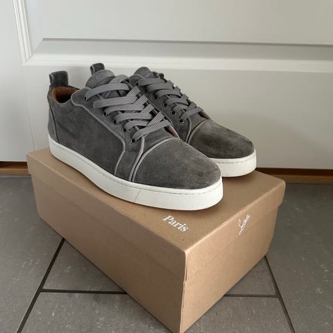 Hei jeg selger disse godt brukte Christian loubitin skoa. Jeg selger de fordi de har blitt for små. De er godt brukt som man ser på bildene. Med noen flekker på sålen og litt slitasje på piggene. Kommer med to sko poser pluss ekstra pigger
