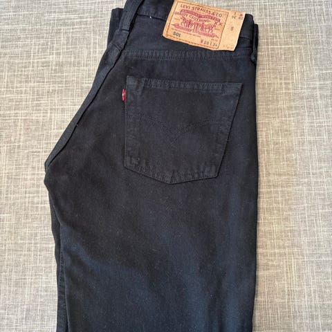 Levi's 501 jeans for herre i svart denim. Buksen har livvidde W32 og benlengde L32, tilsvarende størrelse L. Klassisk 5-lommersmodell i denim med knappelukking i gylfen og skinnpatch med modellnummer bak i linningen. Passer til hverdagsbruk og kan kombineres med ulike overdeler for både uformelle og mer oppkledde antrekk. Svært lite brukt, vasket 2 gr.