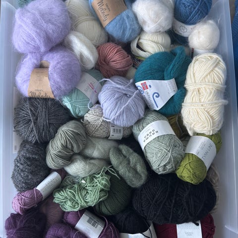 Garnpakke med nøster i ulike farger og kvaliteter. Flere typer garn og strukturer er samlet, egnet til strikking eller hekling av ulike plagg og tilbehør. Inneholder både lyse og mørke farger, samt noen melerte varianter.