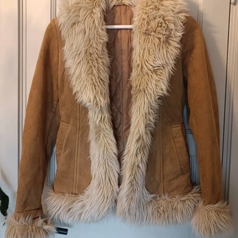 Kjempe kul Penny Lane kåpe kåpe for dame i størrelse L, men er kanskje best for medium, passer også xs og small. Kåpen er brun og laget i polyester. Den har lengre passform og pelslignende kant langs krage, åpning, ermer og nederkant, som gir et markert uttrykk. Modellen har lommer i sidene og er en perfekt jakke for tidlige vårdager. Jakken har blitt malt med brun telstilmaling, så er usikker på om den kan vaskes, derfor har den et sjattert preg, se bilder.