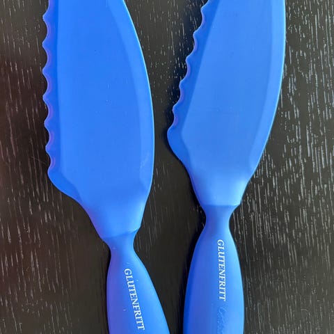 Tupperware kakespade i plast i svart farge. Kakespaden har taggete kant som kan brukes til å skjære og servere kaker og paier. Håndtak med Tupperware-logo. Egnet til bruk på bakebrett og serveringsfat, og praktisk til servering ved kakebord og dessertservering.