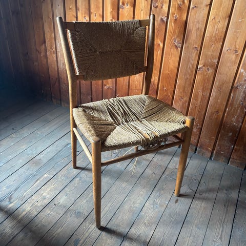 Godt brukt, men den funker fint. Eneste som er litt ødelagt er det ene armlenet. Den sitter løst, men det kan bare limes.