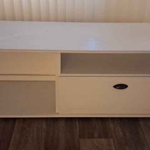 Brukt TV-benk gis bort ved henting i dag eller i morgen. Sideplate sklir ut og må limes.