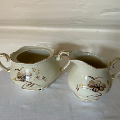 Nydelig sukkerskål og fløtemugge fra Porsgrunn Porselen. Settet er i utmerket stand til å være 70 år gammelt og vintage, det kan minne om grønn Marie i fargen.