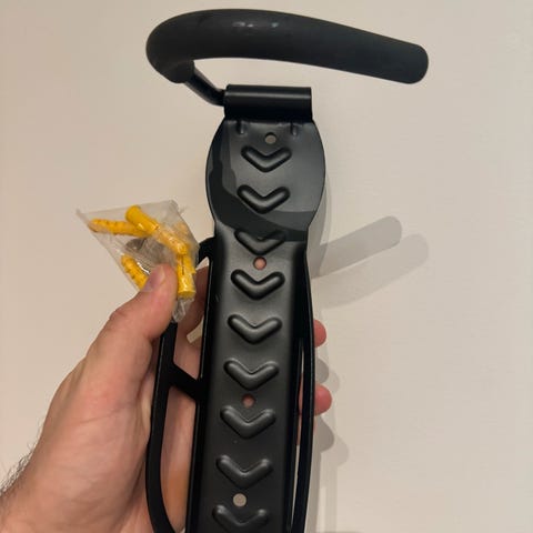 Veggfeste for oppheng av el-sparkesykler. Monteres enkelt på veggen med fire skruer. Holder maks 50 kg avhengig av hvordan veggfestet er skrudd fast i veggen. Gummiert krok gjør at det ikke kommer noen stygge skader på felgen.