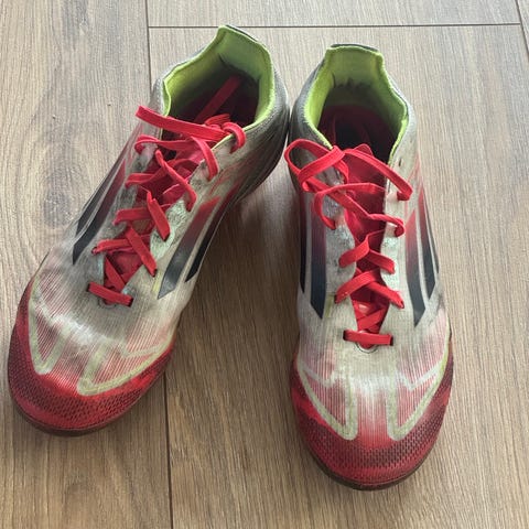 Fotballsko med knotter i blå, hvit og rød farge. Overdelen har mønster med lyse og mørkere blå detaljer samt røde striper på sidene. Sålen er hvit med røde forsterkninger og faste knotter, egnet for bruk på gressbane. Skoene har lisser for justering av passform. Brukt 5 ganger