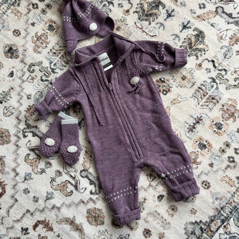 Selger en lite brukt lilla Lillelam Classic ulldress i str 62 i fargen Plomme med tilhørende lue i str 40-42.