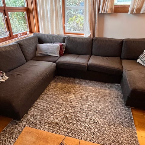 Selger en sofa fra Bohus. Den er elektrisk og kan bli 120 i bredden. Farge mørk grønn til mørk grå. Reparert under siden barna har hoppet litt i den.