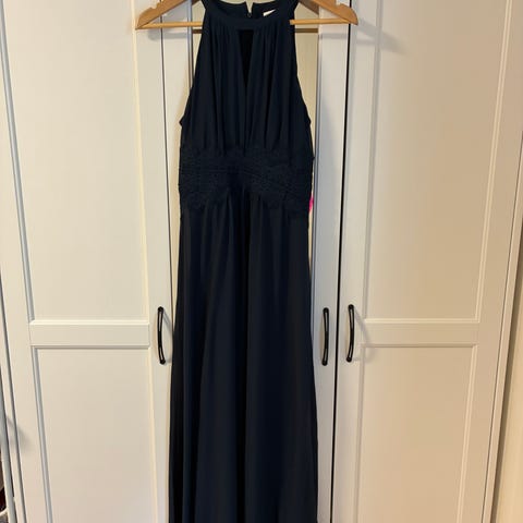 Vila festkjole for dame i størrelse 36. Kjolen er blå og laget i polyester. Modellen er lang med ermeløst snitt og høy hals. Den har markert midje med blonde- eller broderidetaljer og glidelås i ryggen. Egnet som penkjole til formelle anledninger og festbruk.