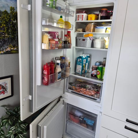 Kombiskapet har kjøledel øverst med flere glasshyller og dørhyller for oppbevaring av matvarer og drikke. Nederst er det frysedel med flere skuffer for oversiktlig lagring av frossenmat. Skapet har separate dører for kjøl og frys, og håndtak i full høyde på begge dører.