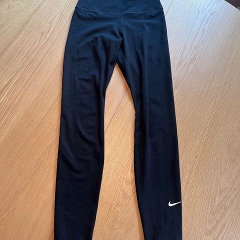 Nike Dri-Fit løpebukse for dame i størrelse M. Buksen er laget i et teknisk, fukttransporterende materiale (Dri-Fit) som er egnet for løping og annen trening. Modellen har elastisk linning med snøring og innvendig strikk med Nike-logo. Nederst på bena er det perforert stoff for bedre ventilasjon. Farge: mørk grønn.