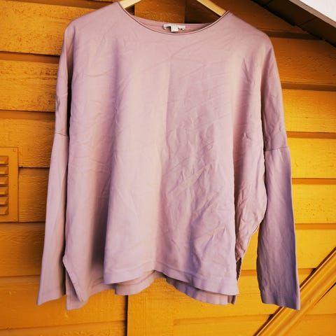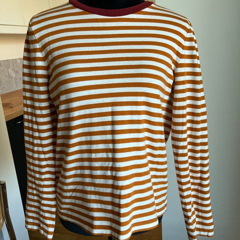 COS T-skjorte for dame i størrelse M (oversize). T-skjorten er flerfarget med horisontale striper i rosa og oransje. Laget av bomull, med rund hals og lange ermer. Passer til hverdagsbruk og kan kombineres med både bukser og skjørt.