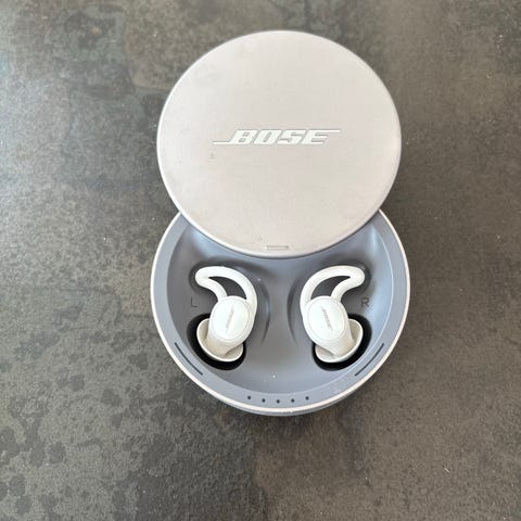 Bose Sleepbuds II trådløse ørepropper i hvit farge. Modellen er utviklet for bruk under søvn og hvile, med ørepropper som ligger tett inntil øret og et rundt ladeetui. Øreproppene kobles trådløst til kompatibel enhet via Bose Sleep-appen, som gir tilgang til forhåndsinnspilte lyder. Leveres med rundt ladeetui og original emballasje slik det vises på bildene.