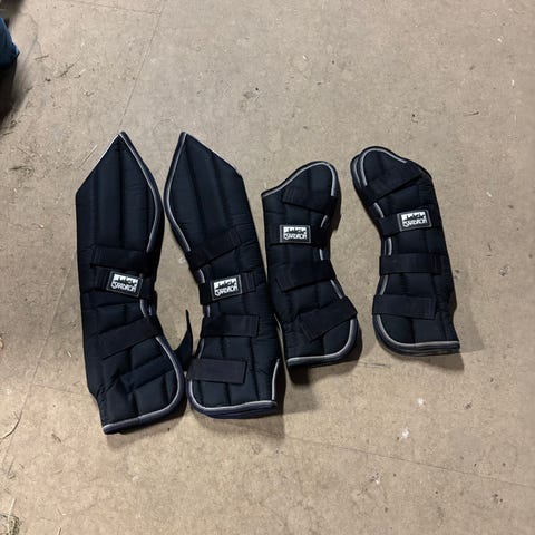 -2stk pent brukt BOT frembeinsbelegg, sorte med strikk. Noe strykslitasje på innsiden, ellers strøkne. Str Full.