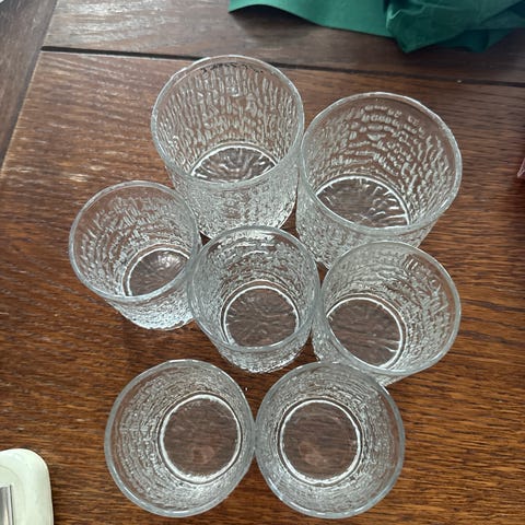 Selger 8 hetvinsglass. Disse er 10 cm. høye og 5 cm. i diameter. Selges samlet for kr. 450,-. Eller kr. 80 per glass. Glassene er uten bruksmerker.
