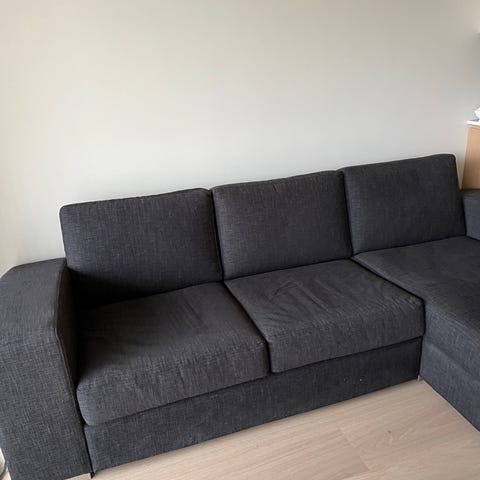 Gir bort en romslig og komfortabel hjørnesofa med sjeselong i mørk grå farge. Den har god plass til flere personer.
