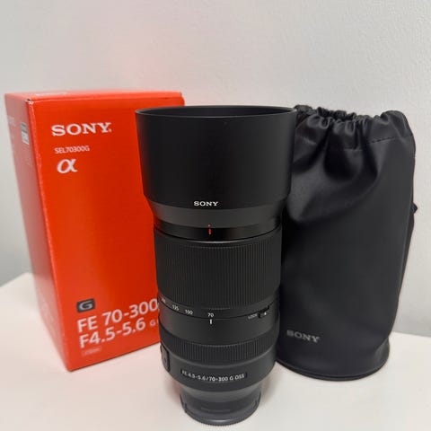 Selger min Sony FE 70-200mm f/4 G OSS i meget god stand. Objektivet er pent brukt og fungerer akkurat som det skal – ingen feil eller mangler.