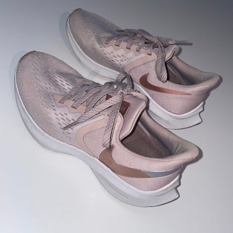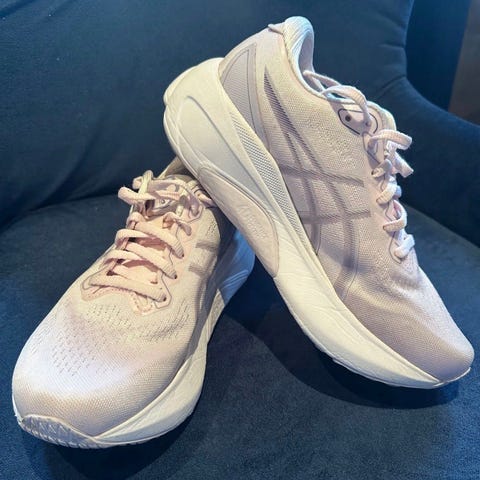 Disse er kun brukt inne på tredemølle, ca 6-7 ganger, og ser helt strøkne ut. Lekker beige/lin farge med gull og refleks detaljer. Gel kayano er veldig behagelige og gode løpesko med pronasjonsstøtte.