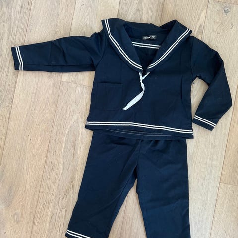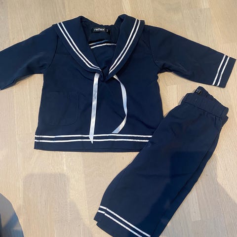 Selger meget pent brukt matrosdress i to deler fra Reflex. Settet består av bukse og overdel. Overdelen har en søt krage med anker på bakstykket. Pent sett til bruk på 17 mai, dåp eller andre anledninger på våren eller på sommerstid 🥰