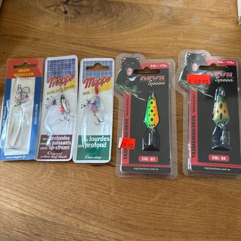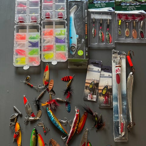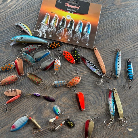 3-4 av spinnerne er godt brukt, mens mesteparten er splitter nye og har bare ligget i slukboksen.