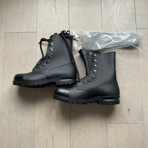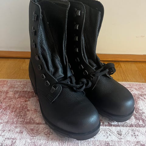 Forsvarets marsjstøvel i svart lær. Støvelen har høyt skaft med snøring og hemper, samt kraftig yttersåle med grovt mønster for godt grep. Egner seg som feltstøvel, arbeidssko eller turstøvel i variert terreng. Laget i slitesterkt materiale med klassisk militært design.