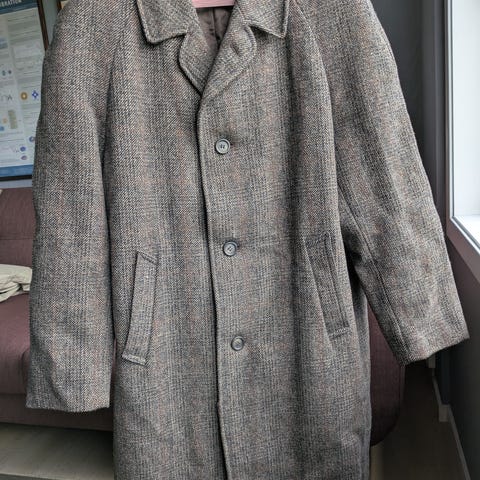 Flott vintage balmacaanfrakk med raglanerme i grått fiskebeinsmønster. Kjøpte på Ebay fra England men var for stor i størrelsen. Dermed har den ikke blitt brukt og selges videre til noen som setter pris på god stil og kvalitet.