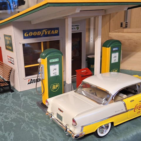 To bensinstasjoner og to kiosker. Alt håndlaget og svært detaljerte. Lager kun disse i skala 1:43. Kan sende: Norgespakke stor/liten. Eller hentes! Det som er på kioskbildene følger med hver kiosk. Med bensinstasjon følger det med Pumpestasjon, et oljefat og pipe. Bilene på bildene er nye og 1 stk kan følge med hver av bensinstasjonene. Ikke nøl med å ta kontakt hvis det er noe du lurer på eller eventuelt komme med et bud.
