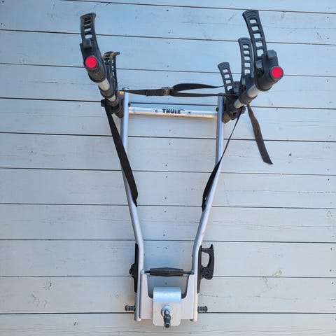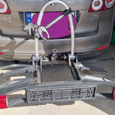 Pent brukt Thule EuroRide 943 sykkelstativ til hengerfeste og tre sykler. Det er et solid stativ med integrert lys (baklys og blinklys) og nummerskiltholder,. Videre har det gode rammeholdere og hjulstropper for å feste syklene.