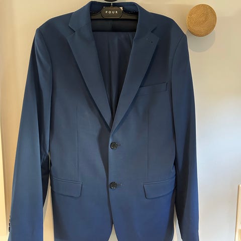 Pen mørk blå dress med lyseblå skjorte. Brukt kun 3 ganger. Jakke str 48, bukse str 46 (livvidde bukse 82 cm) Skjorte str S. Brukt av ungdom ca 175 cm høy. Ny pris ca 5 000,-