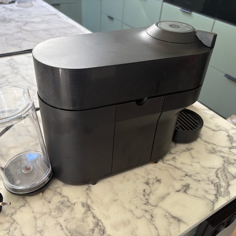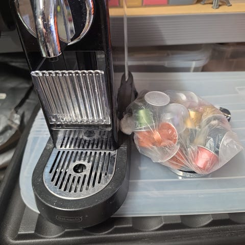 Nespresso kaffemaskin kapselmaskin i svart. Maskinen bruker Nespresso-kapsler og har toppmontert knapp for betjening. Avtagbar kopp- og dryppbrett følger med. Egnet for tilberedning av én kopp kaffe om gangen ved bruk av kompatible kapsler. Strømledning bak på enheten for tilkobling til stikkontakt.