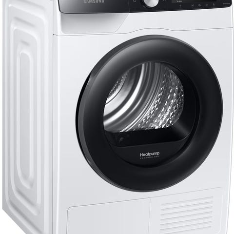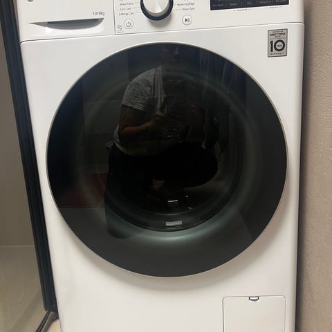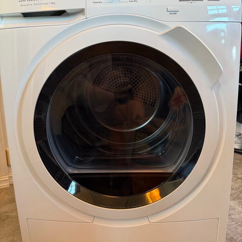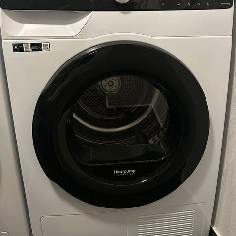 LG kondenstørketrommel i hvit utførelse. Frontmatet modell med stor rund dør og oversiktlig betjeningspanel på toppen. Tørketrommelen er egnet for vanlig husholdningsbruk og kan plasseres frittstående eller stables over en vaskemaskin, slik som vist på bildene. Kondenstypen gjør at fuktigheten samles opp i beholder eller ledes ut via avløp, og den trenger derfor ikke egen lufteslange ut av rommet.