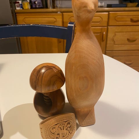 En liten spark i treverk, passer fint til pynt.