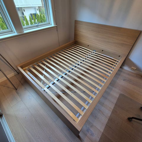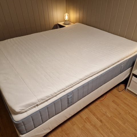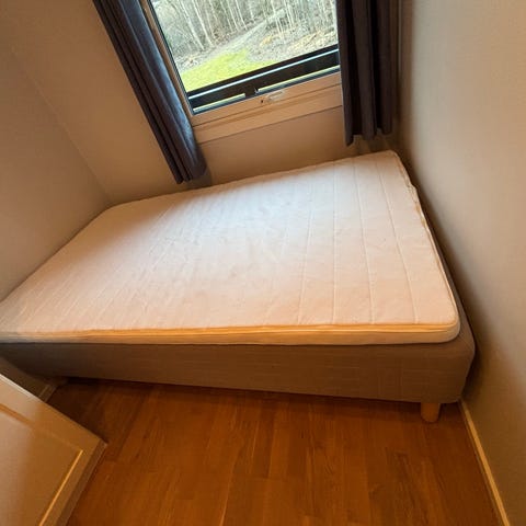 Sengen består av en IKEA Snarum rammemadrass med bein, en IKEA Sennesvik madrass og en IKEA Tussöy overmadrass. Rammemadrassen har treramme med tekstiltrekk. Hovedmadrassen Sennesvik har tekstiltrekk i mørk grå/blå tone, mens overmadrassen Tussöy har lyst trekk.