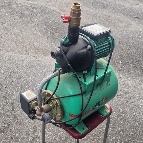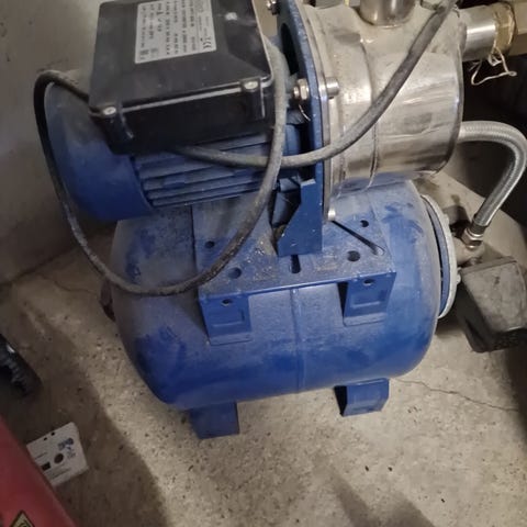 LEO vannpumpe med trykktank. Lekkasje ved manometer, men fullt fungerende pumpemotor. Har vært relativt lite brukt på hytte, og kun til ferskvann.