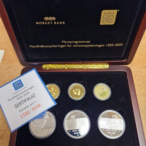 Frimerkeårbokene med kassett er uten synlige feil eller skader. Samlet pålydende er i overkant