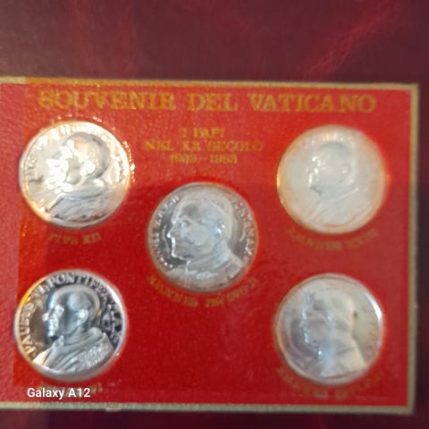 Settet inneholder 9 medaljer i original mappe/plastinnlegg. Motivene viser ulike paver på den ene siden og Vatikan-relaterte motiver/våpenskjold på den andre.