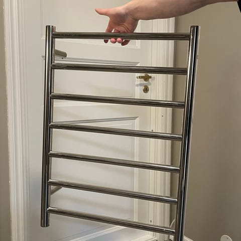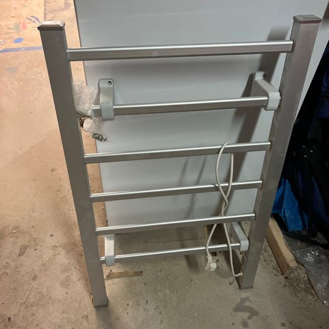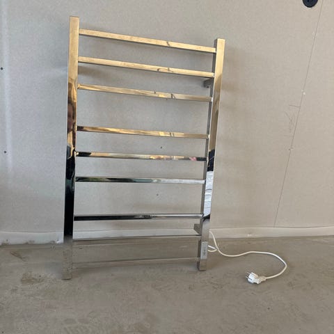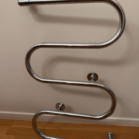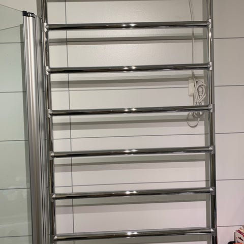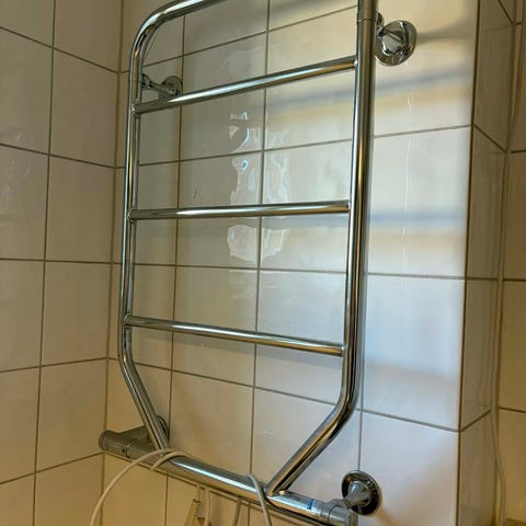 Elektrisk håndkletørker i kromfarget metall. Montert på baderomsvegg med fliser. Flere horisontale ribber gir plass til flere håndklær samtidig. Tilkoblet strøm via ledning med bryter. Egnet til tørking og oppvarming av håndklær på bad eller vaskerom.