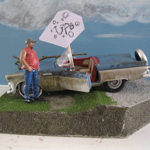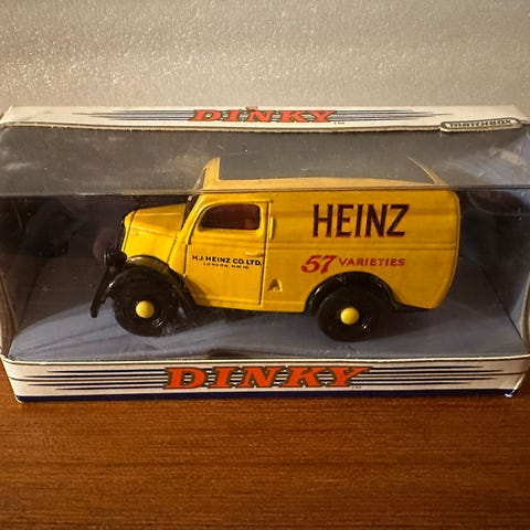 Sett med modellbiler bestående av flere lastebiler og tilhengere i metall. Bildene viser blant annet rød lastebil med gul HEINZ-kasse, rød lastebil med plan og last, blå lastebil med rødt plan, samt to små tilhengere i grønn og brun/gul farge. Modellene har detaljerte karosserier og hjul, og egner seg til lek, samling eller som tilbehør til modelljernbane og diorama. Størrelse og skala er ikke oppgitt, men bilene fremstår som små bordmodeller.Pris fra 165kr.