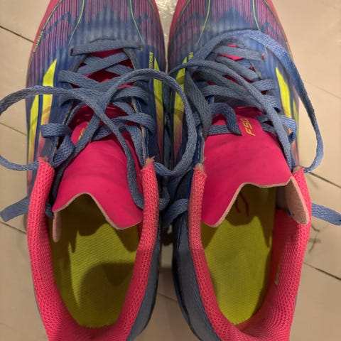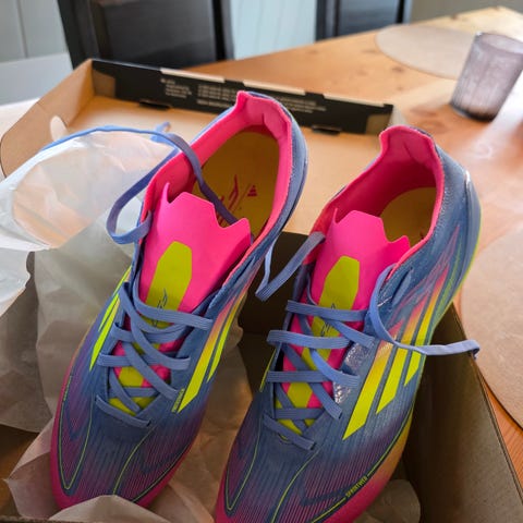 Adidas f50 i flerfarget design med blå, rosa og gule detaljer. Modellen har lisser og lav profil. Yttersålen er tilpasset spill på bane, og overdelen er i syntetisk materiale for lett vekt og god ballfølelse.