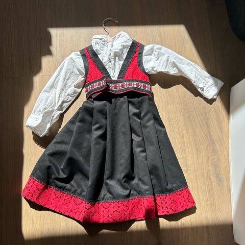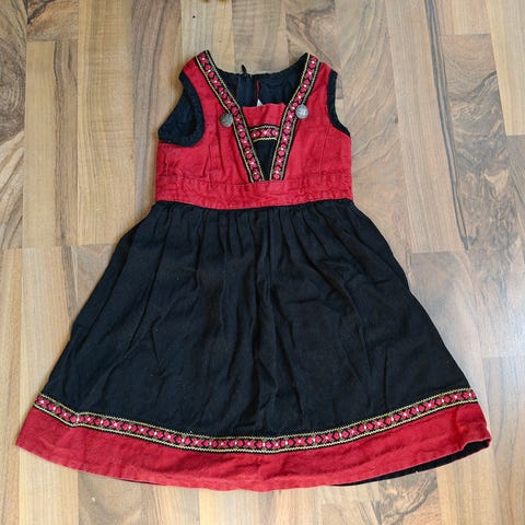 Reflex bunad for jente i størrelse 92. Kjolen er blå og laget i viskose. Den er ermeløs, har utsvingt skjørt og dekorative broderier og bånddetaljer.