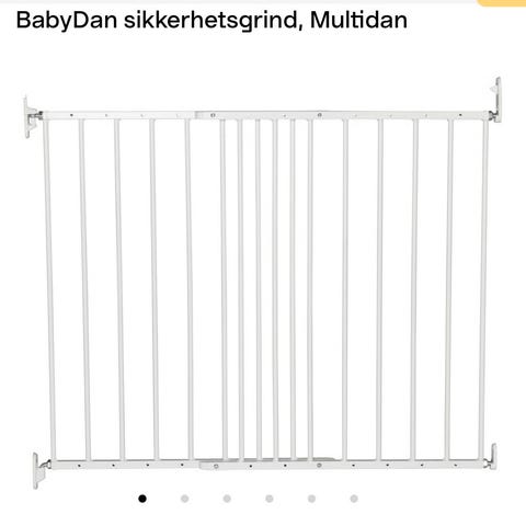 BabyDan sikkerhetsgrind i hvitlakkert metall. Grind beregnet for montering i døråpning eller ved trapp, festes med veggbraketter på begge sider. Åpnes og lukkes med låsemekanisme øverst, betjenes med én hånd av voksen. Egnet som barnegrind eller husdyrgrind for å sperre av trapper eller rom. Passer til rette åpninger innenfor justerbar bredde (mål bør kontrolleres ved kjøp).