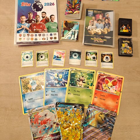 Blandet samling fotballkort, Pokémon-kort og samlekort
