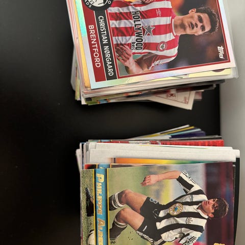 Blandet samling med fotballkort, Pokémon-kort og andre samlekort.