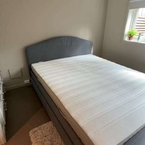 Senga pent brukt av ett barn, men har noen skrammer. Senga har skuffer og mulighet for uttrekk, blir da 160 gjesteseng.
