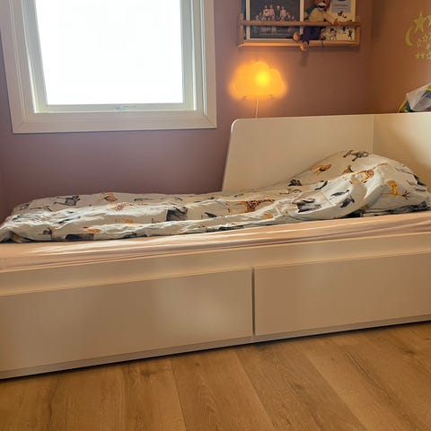IKEA enkeltseng med oppbevaringsskuffer og uttrekk i hvit utførelse. Sengen har skuffer integrert i rammen på langsiden som gir ekstra oppbevaringsplass under madrassen. Egnet som enkeltseng til barnerom eller ungdomsrom.